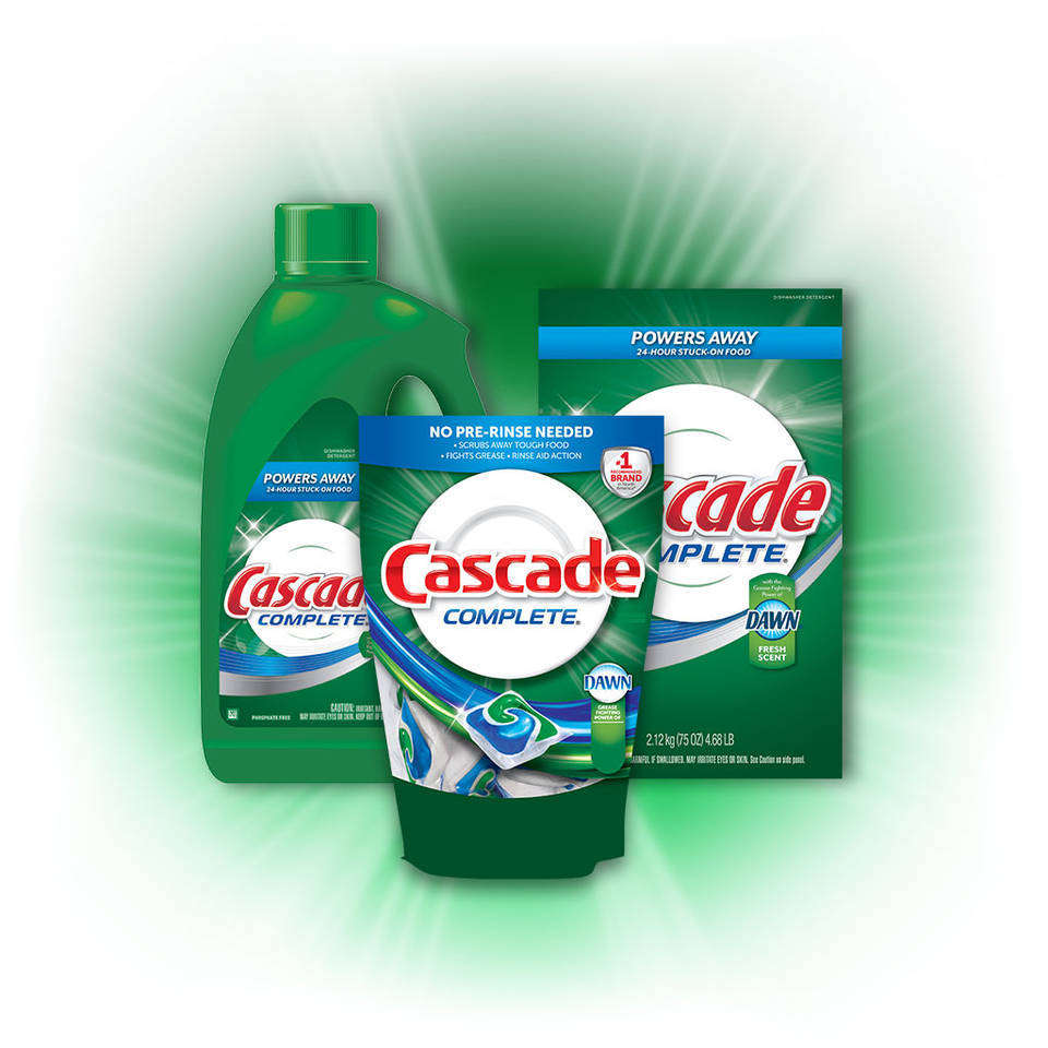 Cascade Complete Powder Cascade ActionPacs Cascade Complete ActionPacs Cascade Platinum Pacs Powers away 24-hour-stuck-on food. Powers away greasy residue for sparkling dishes. Gets dishes completely clean, actually dissolving tough food particles. Advanced triple-action formula helps prevent residue on your dishes and filming on your machine. Grease-fighting power of Dawn ✓ ✓ ✓ ✓ Leaves dishes shining ✓ ✓ ✓ ✓ Eliminates need to prewash ✓ ✓ ✓ Combines the best of Powder and Gel ✓ ✓ ✓ Convenient Pac form ✓ ✓ ✓ Cascade’s best clean ✓