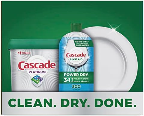 Cascade Platinum Rinse Aid’s sheeting action helps prevent dish water from clinging to your dishes during your machine’s rinse cycle so your dishes rinse cleaner, dry faster and more effectively,* and come out dry and shining with virtually no water spots or streaks. *vs. detergent alone