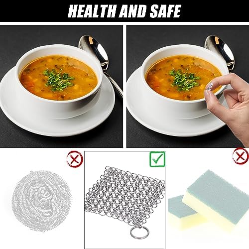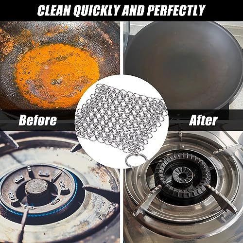 Durability: This cast iron skillet cleaner is machine soldered by Premium Stainless steel, It is ideal for cleaning all your cast iron cookware. Each chainmail ring is designed with the highest quality food grade stainless steel in the industry to be smooth enough for pans, scrub any residue with warm water which will release quickly and easily.
