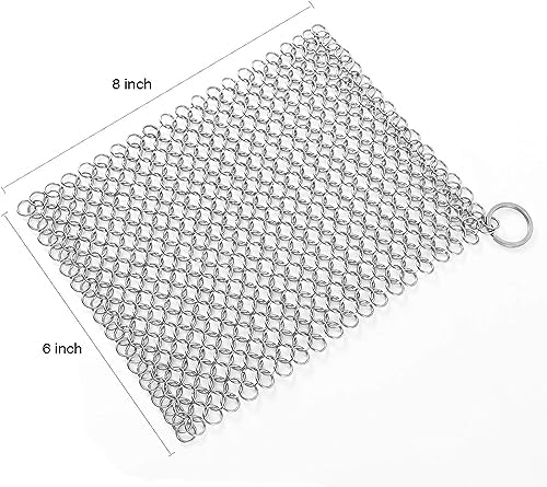 DURABILITY : This cast iron skillet cleaner is machine soldered by Premium 316L Stainless steel, It is ideal for cleaning all your cast iron cookware, such as cast iron pans , pre seasoned cast iron , skillets, dutch ovens , camp chef griddles , waffle irons and so on . Boasting unmatched durability and built to last as long as your cast iron products. Each chainmail ring is designed with the highest quality food grade stainless steel in the industry to be smooth enough for pans.