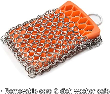 【Easy to Clean】- This cast iron scrubber is dishwasher safe. And it’s easy to hand wash, Rinse the cast iron scrubbing pad in hot soapy water, then hand dry it. Also, the chainmail and silicone insert can be separated, so that the chainmail and silicone can be cleaned up deeply.