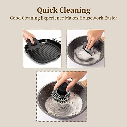 💧Widely used💧: Chain mail scrubber cast iron can remove dirt, rust or greasy dirt on most cooking utensils, such as cast iron pans, frying pans, grills, baking pans, and even pizza stones. The pan/grill scraper can be used to safely remove stubborn food waste residues on the cast iron pan/grill. It is a necessary kitchen tool!