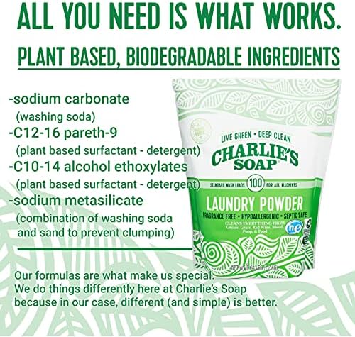 The secret to a happy life with clean clothes while doing your share for Mother Earth shouldn’t be complicated. Use our concentrated Laundry Powder detergent. It deep cleans your laundry for only pennies per wash (one tablespoon per large load), as it removes trapped odors and stains. Hypoallergenic, non-toxic, safer for the environment. Plus, it removes residues from your previous detergent. No need for fabric softener, either. Septic safe. With each wash, clothes washed in Charlie’s Soap get cleaner and cleaner.
