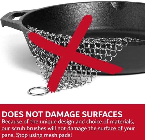 DOES NOT DAMAGE SURFACES – Because of the unique design and choice of materials, our scrub brushes will not damage the surface of your pans. It is even safe to use on cast iron. Stop using mesh pads!