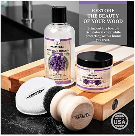 INCLUDES: CLARK’S Cutting Board food grade mineral oil (12oz), Cutting Board wood wax (6oz) & CLARK’S Custom Applicator and Buffing Pad.