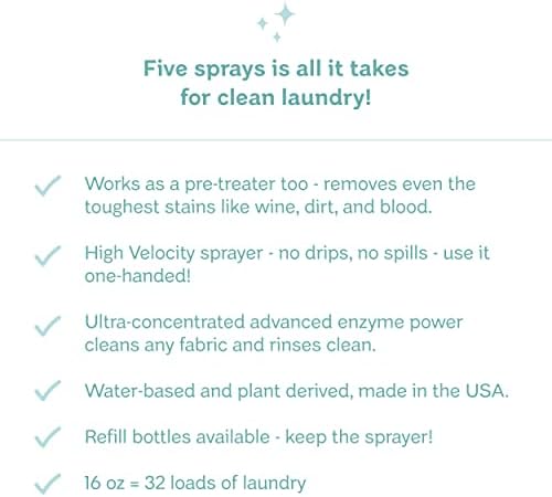 5 sprays or ½ ounce = 1 load: smaller packaging, less water, and it works better than traditional detergents. Works on every type of fabric, delicates, baby clothes (and stains!), athletic wear, sports uniforms, sheets, towels, colors, brights, whites, cashmere + wool. Everything. If you have multiple bottles of detergent for different types of laundry, you don’t need them. Laundry Detergent Spray is all you need – really!