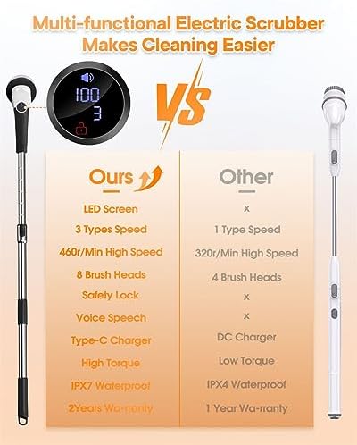 3 Adjustable Speeds: Low Speed(260RPM) / Medium speed (360RPM) / High Speed(460RPM)3 Section Extendable Handle: 3-section design(12/35.8/43.3 inches)2500mAh BatteryUSB-C Fast ChargingIPX7 WaterproofLCD DisplayProtect the settingWork for up to 90 minutesUpgrade Voice BroadcastMulti-functional 8 Rpleaceable Brush Heads