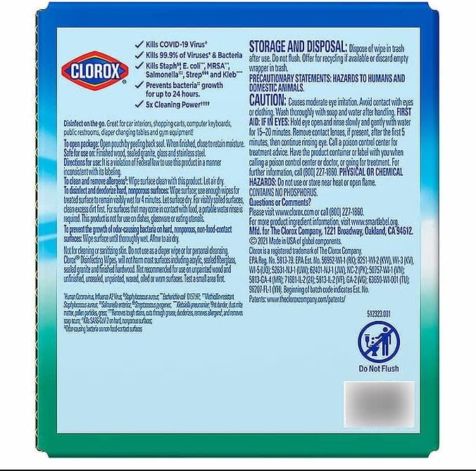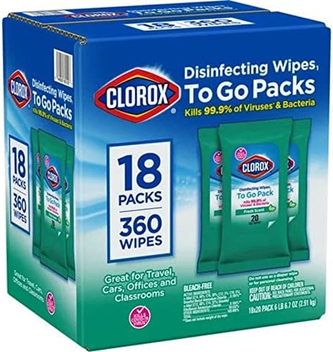 Clorox Disinfecting Wipes To Go clean, disinfect and clean for 5x cleaning power and leave a clean fresh scent. Take disinfecting on the go — in your car, purse, gym bag, carry-on or desk drawer —with these Clorox wipes. These travel packs of disposable wipes clean messes on surfaces like shopping carts, airplane tray tables , public bathroom surfaces, cell phones, gym equipment and more. These bleach-free wipes are safe to use on finished wood, sealed granite and stainless steel. Disinfecting Wipes are also great on non-food-contact surfaces in the home, office, classroom, pet area, dorm and locker room. Removes tough stains, cuts through grease, deodorizes, and removes soap scum.