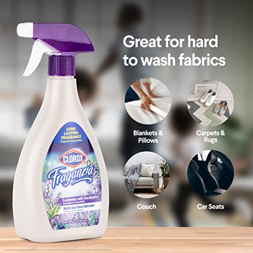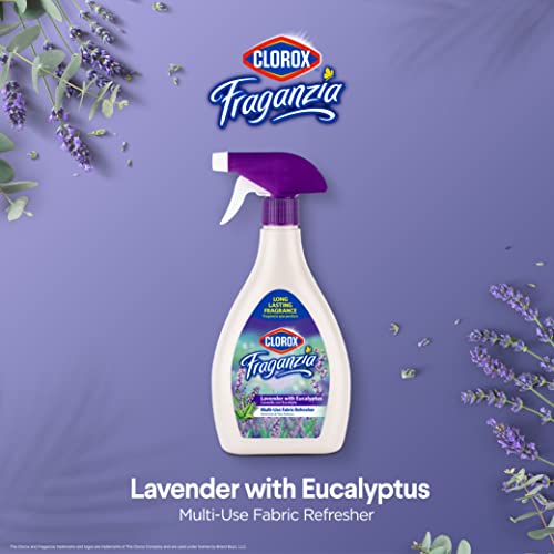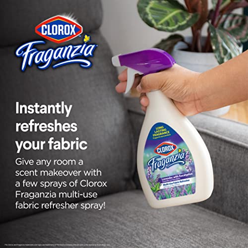 Give your home an instant scent makeover with Clorox Fraganzia Multi-Use Fabric Refresher Spray! Clorox Fraganzia is dedicated to a scent-sational cleaning experience. Our line of irresistible scents in convenient sprays refresh your home quickly and easily. Use Clorox Fraganzia Multi-Use Fabric Refresher Spray by simply spraying onto soft surfaces around the home, leaving behind a fragrance that lasts & lasts! Embark on a scented journey with room refresher sprays from Clorox Fraganzia. The Lavender with Eucalyptus scent of this multi-use refresher spray invites calming lavender into your home for a scent that soothes the senses, blended with a vibrant pop of invigorating eucalyptus. Our scent-sational scents have lasting effects that can brighten up any area of the home.Use Clorox Fraganzia Multi-Use Fabric Refresher Spray to combat everyday smells in common areas like couches, throws, and curtains. Add to your regular cleaning routine and give your fabrics a weekly refresh. Spray until fabric is damp, let dry, and enjoy freshness all around your home. Tackle the smells that linger long after sports practice ends by spraying down gym bags, yoga mats, and sports uniforms. Spruce up guest areas with a quick spritz to guest bedding, towels, and shower curtains. When the car is smelling bit musty, freshen it up by spraying down cloth mats and car seats. For best results, spray fabric from 18-24 inches away. For a noticeably fresher home, add to your regular cleaning routine and give your fabrics a weekly refresh. Spray on household fabrics and carpets. Do not use on leather, suede, silk, or fabrics that may result in water spots. Warnings: Keep out of reach of children and pets.Your satisfaction is our priority. Contact us with questions regarding this product.