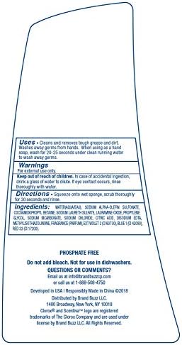 Indulge your home with Clorox Scentiva. Clorox Scentiva will keep your household clean while filling your home with uplifting, inviting, and long-lasting scents. Scentiva fragrances are carefully curated to freshen and invigorate your home and transform your entire cleaning experience. This ultra-concentrated Clorox Scentiva dishwashing liquid formula will rid your dirtiest dishes and kitchen tools of grease. The sleek dish soap bottle design can sit nicely on your kitchen counter or can be used to refill your favorite dispenser.Directions: Squeeze onto wet sponge, scrub thoroughly for 30 seconds and rinse. Do not add bleach. Not for use in dishwashers.Ingredients: Water (Aqua/Eau), Sodium Alpha-Olefin, Sulfonate, Cocoamidopropyl Betaine, Sodium Laureth Sulfate, Lauramine Oxide, Propylene Glycol, Sodium Bicarbonate, Sodium Chloride, Citric Acid, Disodium EDTA, Methylisothiazolinone, Fragrance (Parfum), Blue 1 (CI 42090), Yellow 5 (CI 19140). Warning: For external use only. Keep out of reach of children. In case of accidental ingestion, drink a glass of water to dilute. If eye contact occurs, rinse thoroughly with glass of water.YOUR SATISFACTION IS OUR PRIORITY- If you have any questions or feedback, please reach out to us directly at info@brandbuzzcp.com