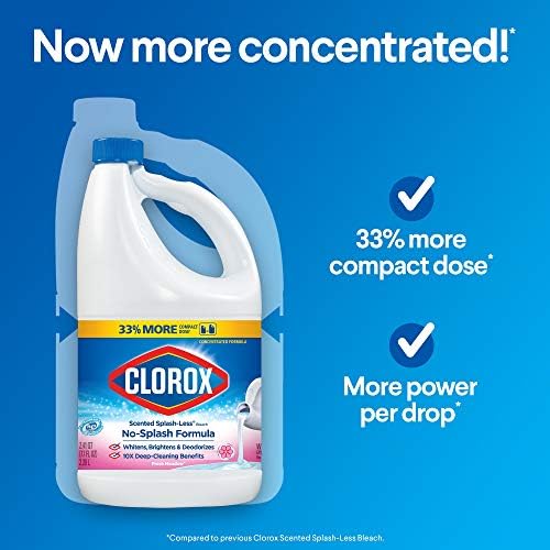 Clorox Scented Splash-Less bleach, in a slimmed down version, is easy to handle and pour. With a 33% more compact dose compared to previous Clorox Splash-Less bleach, you get more cleaning power per drop, reducing the amount of bleach required per cleaning. With a Splash-Less formula, this bleach delivers controlled pour, resulting in a powerful clean but with less spilling and splashing. In a concentrated formula, Clorox Splash-Less bleach whitens, brightens, deodorizes and provides 10x deep Cleaning benefits, removing tough stains from white clothing including red wine, grass, dirt and blood stains. Americas #1 bleach is perfect for getting some serious cleaning done without worrying about spills or splashes so that you can confidently clean household surfaces. It is safe for use in Standard and HE washers. A little goes a long way with Clorox Splash-Less bleach. Based on iri mulo unit sales 52 weeks ending 12/29/19. Use as directed.