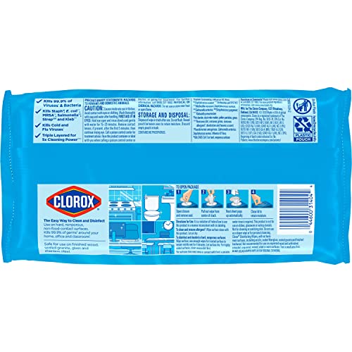 Clorox Disinfecting Wipes come in a convenient easy to pull dispensing pack make cleaning easy. This flexible pack allow you to easily dispense, clean and disinfect while storing, stacking or taking on the go is a breeze. Clorox Disinfecting Wipes clean, disinfect, deodorize and remove allergens for 5x cleaning power* and leave a lemon scent. Disinfecting Wipes kill 99.9% of viruses and bacteria that can live on surfaces, including COVID-19* Virus, staph, E. coli, MRSA, salmonella, strep and Kleb. These all-purpose wipes remove common allergens, germs and messes on kitchen counters, bathroom surfaces and more and can prevent the growth of bacteria* for up to 24 hours. *5x cleaning power: cleans, disinfects, deodorizes, removes allergens, leaves a scent, removes dirt, removes grime. Kills COVID-19 virus: kills SARS-CoV-2 on hard, nonporous surfaces. Use as directed. Prevents the growth of bacteria: odor causing bacteria on non-food contact surfaces. Allow product to air dry.