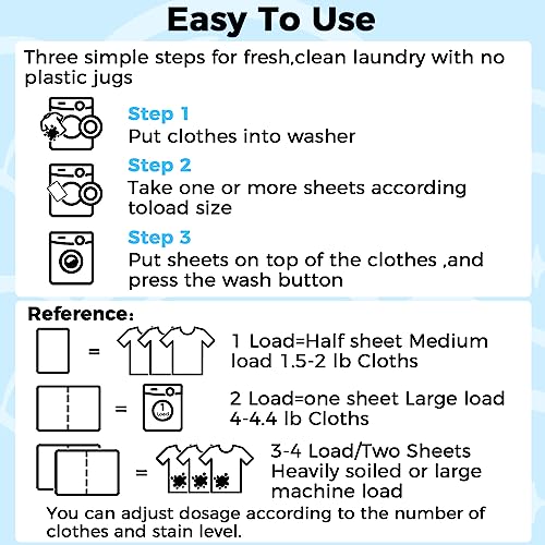 Easy to Use:Simply toss one sheet into your washing machine along with your clothes,and let it dissolve completel during the wash cycle and no residue after wash.Eliminating the need for measuring,pouring,or dealing with messy liquid or powder detergents.It’s designed to use in both standard and High Efficiency (HE) washing machines and hand wash.