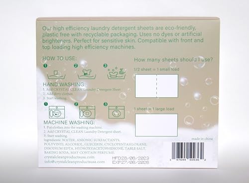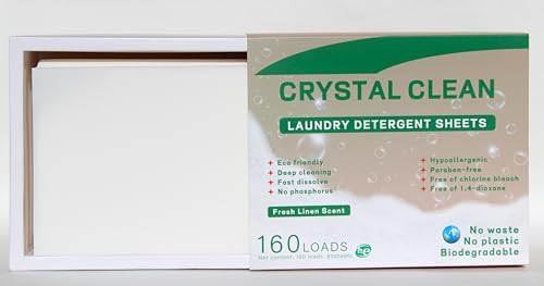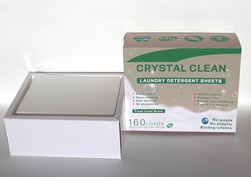 CRYSTAL CLEAN Laundry Detergent Sheets. up to 160/loads – 80/sheets, Fresh Linen Scent. All sheets have a perforated center. Our high efficiency laundry detergent sheets are ideal for everyday laundry cleaning. Including cottons, linens, blends, and durable synthetics. It’s also safe for whites and all colors. Can be used in hot, cold, hard, or soft water. Our powerful concentrated laundry detergent sheets are eco-friendly, plastic free with recyclable/biodegradable packaging. Compatible with front and top loading, high efficiency and standard washing machines. Hypoallergenic and Paraben-free safe for sensitive skin.
