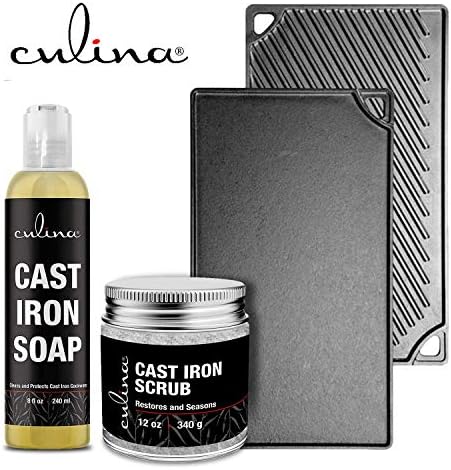100% Plant-Based Cast Iron Cleaning Scrub & Soap Set designed to build & maintain the best natural non-stick seasoning for your cast iron skillets, pans, woks or grills. Made with a solvent-less refined coconut oil base that unlike our competitors is safe & guaranteed to never go rancid. Designed protect cookware from moisture that leads to damage & rust. Makes cleaning cast iron easier by creating a seasoning that is non-stick & prevents food from drying on. | – IDEAL FOR – | Cast Iron Skillets, Cast Iron Pots & Frying Pans, Cast Iron Grills & Griddles, Cast Iron Woks, Cast Iron Dutch Ovens, Cast Iron Cookware. | – DIRECTIONS – | For cast iron that has rust damage, use Culina Cast Iron Salt Scrub first to remove any damage spots or burnt food. Wash & clean your cast iron cookware with Culina Cast Iron Soap to remove any left-over food residues. | – INGREDIENTS – | SOAP: Water, Organic Castile Soap, Glycerin, Proprietary Blend of Pure Essential Oils. SCRUB: Solar Evaporated Sea Salt, Refined Coconut Oil, Proprietary Essential Oil Blend. This product can be used by itself or as part of the culina cast iron kits to clean the following: cast iron cleaner kit cast iron cleaning cast iron kit cast iron pan cleaner cast iron skillet cleaner cast iron cleaner cast iron cleaning carbon steel seasoning oil cast iron care cast iron care kit cast iron clean cast iron cleaner chainmail scrubber cast iron seasoning spray cast iron skillet cleaner kit cast iron skillet oil cast iron skillet soap cast iron soap and oil cast iron spray cast iron treatment clean cast iron skillet dutch oven cleaner enamel cast iron cleaner enamel cleaner cask carbon treatment enamel ringer blackstone & baking chainmail seed knapp eraser cask iron cleaner cast cast iron cleaner cast iron cleaning flaxseed oil cast iron flaxseed oil for cast iron seasoning griddle cleaner kit le creuset cleaner enamel lodge seasoned cast iron care kit oil for cast iron skillet ringer cast iron skillet cleaner seasone