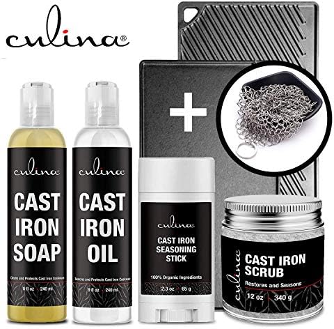 TAKE THE WORK OUT OF CARING FOR YOUR CAST IRON Anyone who owns cast iron cookware knows that it can be a real chore to maintain a well-seasoned surface. Culina makes the process easy with our Cast Iron Cleanser. This effective all-natural cleaning solution is petroleum-free, leaves no sticky residue on your surfaces, and help to reduce and eliminate odors. SUPERIOR CLEANING AND ODOR CONTROL Culina Cast Iron Cleanser naturally cleans all cast iron cookware, woks, dutch ovens, griddles and more, removing stubborn odors and cooked on food while preserving the seasoned cooking surface. Use this gentle cleanser alongside Culina Cast Iron Conditioner to keep all of your cast iron at its best. Culina Cast Iron Cleanser naturally cleans all cast iron cookware, woks, dutch ovens, griddles and more, removing stubborn odors and cooked on food while preserving the seasoned cooking surface. Use this gentle cleanser alongside Culina Cast Iron Conditioner to keep all of your cast iron at its best. This product can be used by itself or as part of the culina cast iron kits to clean the following: cast iron cleaner kit cast iron cleaning cast iron kit cast iron pan cleaner cast iron skillet cleaner cast iron cleaner cast iron cleaning carbon steel seasoning oil cast iron care cast iron care kit cast iron clean cast iron cleaner chainmail scrubber cast iron seasoning spray cast iron skillet cleaner kit cast iron skillet oil cast iron skillet soap cast iron soap and oil cast iron spray cast iron treatment clean cast iron skillet dutch oven cleaner enamel cast iron cleaner enamel cleaner cask carbon treatment enamel ringer blackstone & baking chainmail seed knapp eraser cask iron cleaner cast cast iron cleaner cast iron cleaning flaxseed oil cast iron