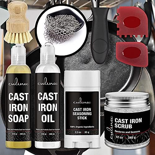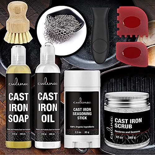 100% Plant-Based Cast Iron Seasoning Oil, Cleaning Scrub & Soap Set designed to build & maintain the best natural non-stick seasoning for your cast iron skillets, pans, woks or grills. Made with a solvent-less refined coconut oil base that unlike our competitors is safe & guaranteed to never go rancid. Designed to season & condition cast iron while protecting cookware from moisture that leads to damage & rust. Makes cleaning cast iron easier by creating a seasoning that is non-stick & prevents food from drying on. | – IDEAL FOR – | Cast Iron Skillets, Cast Iron Pots & Frying Pans, Cast Iron Grills & Griddles, Cast Iron Woks, Cast Iron Dutch Ovens, Cast Iron Cookware. | – DIRECTIONS – | For cast iron that has rust damage, use Culina Cast Iron Salt Scrub first to remove any rust spots or burnt food. Wash & clean your cast iron cookware with Culina Cast Iron Soap to remove any left-over food residues. Dry the cast iron completely before applying oil. Pour one teapoon of Culina Cast Iron Oil, or more for larger surfaces, onto the cookware & use a soft cloth to work the oil into the cast iron. Let sit, and dry for 30 minutes. | – INGREDIENTS – | OIL: Refined Coconut Oil, Proprietary Blend of Pure Essential Oils. SOAP: Water, Organic Castile Soap, Glycerin, Proprietary Blend of Pure Essential Oils. SCRUB: Solar Evaporated Sea Salt, Refined Coconut Oil, Proprietary Essential oil Blend. This product can be used by itself or as part of the culina cast iron kits to clean the following: cast iron cleaner kit cast iron cleaning cast iron kit cast iron pan cleaner cast iron skillet cleaner cast iron cleaner cast iron cleaning carbon steel seasoning oil cast iron care cast iron care kit cast iron clean cast iron cleaner chainmail scrubber cast iron seasoning spray cast iron skillet cleaner kit cast iron skillet oil cast iron skillet soap cast iron soap and oil cast iron spray cast iron treatment clean cast iron skillet dutch oven cleaner enamel cast iron cleaner enamel cleaner c