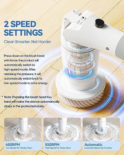 🌊【2 Speeds & 3 Cleaning Ways】The cleaning scrubber electric has 2 speeds to select. Low-speed 450RPM is suitable for your daily cleaning and high-speed 550RPM is used for deep cleaning. In addition, press down on the brush head with pressure, the scrubber will automatically switch to high-speed mode and after releasing the pressure, it will automatically switch back to low speed.