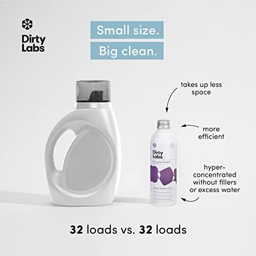 DIRECTIONS: Follow your garment care label and washing machine instructions. Measure with Dirty Labs silicone beaker (washable & reusable) according to load size. For tough stains, pretreat directly to soil area and allow to sit for 5 minutes before washing. Our detergent is hyper-concentrated use as follows: 8ml for medium loads, 12ml for large loads, 16 ml for x-large loads.