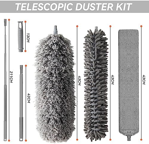 【Telescoping Duster】The upgraded stainless steel long pole is more sturdy and won’t rotate can reach up to 250cm. An extension pole set is designed to easily reach and clean all kinds of weird angles and awkward surfaces. Attached to 3 different microfiber dusters, allows you to dust cobwebs/high ceiling fans easily and effectively without climbing ladders dangerously.