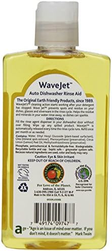 Wave Jet is the first all natural spot and residue eliminator for auto dishwashing machines. Works just like the conventional auto dish washing spot removers, but without the petro chemicals. Comes in a convenient 8-ounce size bottle. Just fill your rinse agent dispenser in your dish washing machine. Refill once per month or as needed. 100% biodegradable. Comes in a number 1 pet bottle.