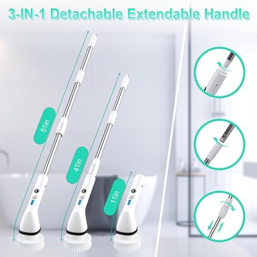 Cordless Efficient Cleaning – Dual Speed ModeStep up your cleaning game with our cordless electric spin scrubber that delivers powerful, faster cleaning results. This shower scrubber has a brand new motor with two speeds, from a low 300 RPM to a powerful 400 RPM. Simply press the button to adjust the speed and unleash maximum power to effortlessly tackle stubborn dirt. Cut your cleaning time in half and say goodbye to sore backs and arms.3-IN-1 Detachable Extendable HandleSay goodbye to back pain while cleaning! Our bathroom cleaning brush comes with two detachable handles. The short handle is perfect for mid-level areas, while connecting the two long handles is ideal for low and high areas, eliminating the need to bend or kneel while cleaning. The floor brush with extendable handle reaches from 11 inches to 51 inches, making ceiling cleaning a breeze.Multi-Function Brush Head KitElectric scrub brush comes with six brushes for different situations: Large Flat Brush for a variety of surfaces, floors or stairs; Dome Brush for bathtubs and toilets; Sponge Brush for glass and cars; Corner Brush for corners and edges; Glass Tile Cloth Brushes; and Fiber Brushes for stoves and sinks. Deep cleaning and brightening your home has never been easier.Large Capacity & Long Battery LifeThe cordless Power Scrubber has a 2500mAh large-capacity battery that can be quickly charged in 2.5 hours and can be used continuously for up to 90 minutes. The bathroom scrubber features a 4-level battery indicator that allows you to check the battery level and charge it promptly. With IPX6 waterproof capability, there is no need to worry about malfunction due to water intrusion.Perfect GiftAs a Mother’s Day, Father’s Day or Christmas gift, this electric spin scrubber drier is an excellent choice for family, friends or anyone who does not like to clean. It allows them to handle tedious cleaning tasks with ease and efficiency. In addition, the Electric Floor Brush comes with a wall mount for convenient storage and a mesh drawstring bag for storing accessories and preventing loss.
