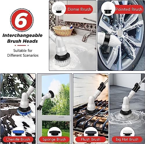 【6 Replaceable Brush Heads】 Electric scrubber is equipped with 6 different types of replaceable brush heads and 1 extension arm, so you can choose the right combination to clean the stains in different cleaning environments. Automatic shower cleaning scrubber can be used indoor and outdoor, Electric Cleaning Brush is great for curves, tile, sink bowls, toilets, bathtub, door slots, shower windows, electric bathroom scrubber also cleans car tires and mags well.
