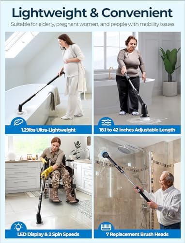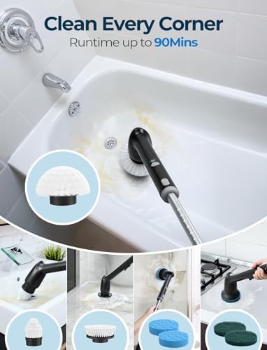↗【𝗘𝘅𝘁𝗲𝗻𝗱𝗮𝗯𝗹𝗲 𝗛𝗮𝗻𝗱𝗹𝗲, 𝗕𝗮𝗰𝗸 𝗦𝗮𝘃𝗲𝗿】This PureSwirlz bathroom scrubber electric is fantastic for anyone that has a bad back, as reaching the high and low places will killing your back or knees. It’s also easy to maneuver no matter where you use it since its handle extends up to 42 inches long. This scrubber will save you a lot of elbow work & lower back cleaning specially the tub you hate bending!