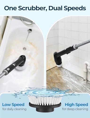 🌀【𝗧𝘄𝗼 𝗦𝗽𝗶𝗻 𝗠𝗼𝗱𝗲𝘀】PureSwirlz electric spin scrubber has a low (280RPM) and a high speed (350RMP) to choose from, whether you’re cleaning stubborn stains or dirty grout. It’s pretty simple to use this bathroom scrubber electric — put the desired brush on and push the power button. Just make sure to put the cleaner you’re using on stubborn stains before cleaning with it.