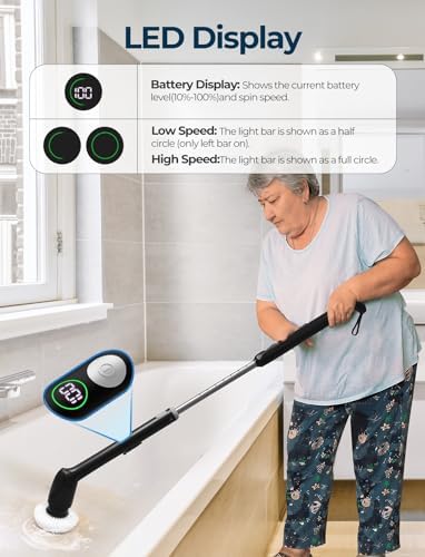 📹【𝟮𝟬𝟮𝟰 𝗡𝗲𝘄 𝗘𝗹𝗲𝗰𝘁𝗿𝗶𝗰 𝗦𝗵𝗼𝘄𝗲𝗿 𝗦𝗰𝗿𝘂𝗯𝗯𝗲𝗿 𝘄𝗶𝘁𝗵 𝗟𝗘𝗗 𝗗𝗶𝘀𝗽𝗹𝗮𝘆】The PureSwirlz bathroom scrubber electric has an LED display, making it easy to tell what speed you are on and how much of a charge the battery has. Half Circle: Low Speed; Full Circle: High Speed. Now more guessing about the operating statues, and the LED display is bright and large, which is especially for the elder or those with poor eyesight.