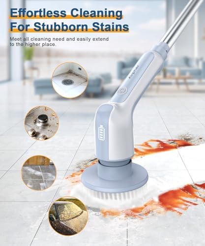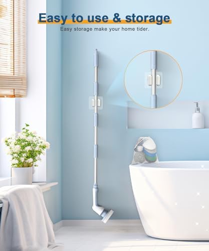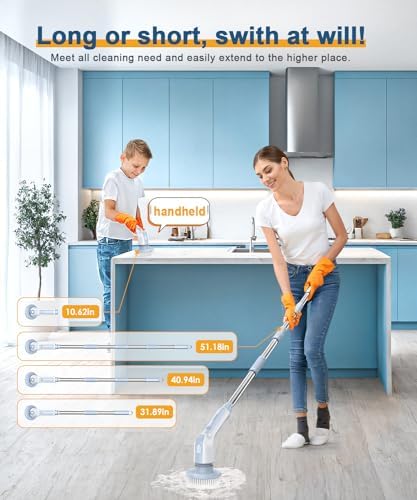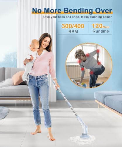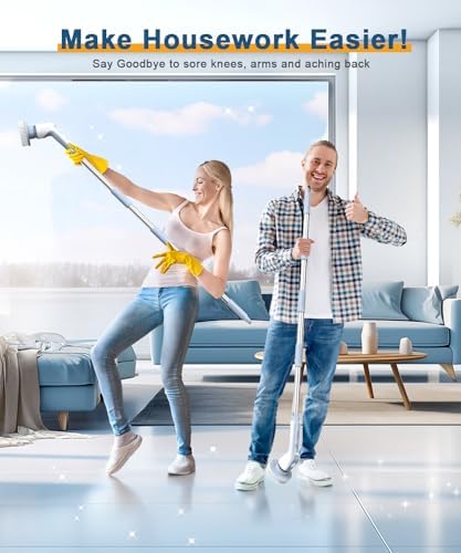 🎀【2 Adjustable Speed & 4 Adjustable Lengths】Electric Spin Scrubber has 2 adjustable spin speeds: 300RPM for daily cleaning and 400RPM for deep clean, meeting your different cleaning needs. Especially when used with a cleaning agent, it can quickly clean stubborn stains and make entire house look new! The handle extends from 10.62 inches to 51.18 inches easy to clean hard-to-reach places, without kneeling or bending over.