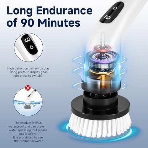 Clear battery display and good battery life: The power rotary scrubber has a battery display function, making it easy to understand the power consumption situation. Equipped with a 2000mAh high-capacity battery, it only requires 3 hours of fast charging and can provide 90 minutes of long-term operation.