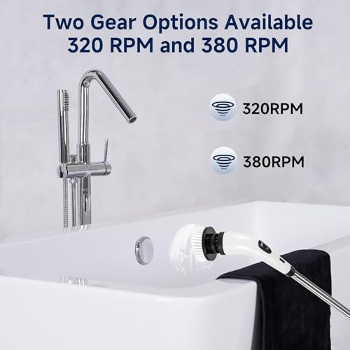 The two speed rotation mode is suitable for various scenarios: the rotary scrubber has two adjustable rotation speeds, 320RPM and 380RMP, respectively, to choose from, making it very suitable for handling difficult cleaning tasks in bathrooms, bathtubs, stone flooring, cement slurry, grooves, and toilets. (Lightly press to open, long press to enter gear selection, lightly press to switch gears, long press to close)
