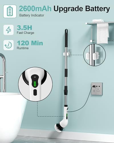 This cordless shower scrubber comes with a massive 2600 mAh battery, which can last continuously up to 90 mins after 3.5 hours fast charging.