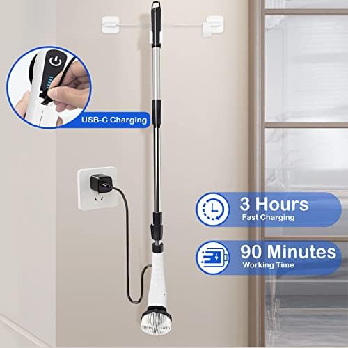 【Rechargeable & Cordless & Waterproof】After only 2 hours of fast charging using the new type C charging mode (which doesn’t require a traditional plug), the spin scrubber can be used for approximately 120 minutes. With this electric bathroom scrubber, there’s no need for long wires, allowing you to clean any corner of the room with ease. Despite its powerful performance, the scrubber produces a low sound volume of under 70db. Notice: it can not be used underwater.