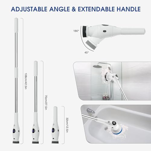 Adjustable Angle & Retractable Handle:AYJICE electric bathroom scrubber handle is detachable (up to 42.5 inches) and the angle is adjustable (45°, 180°) to fit various edge and crevice areas without bending and kneeling down . Lightweight and flexible, making cleaning easier