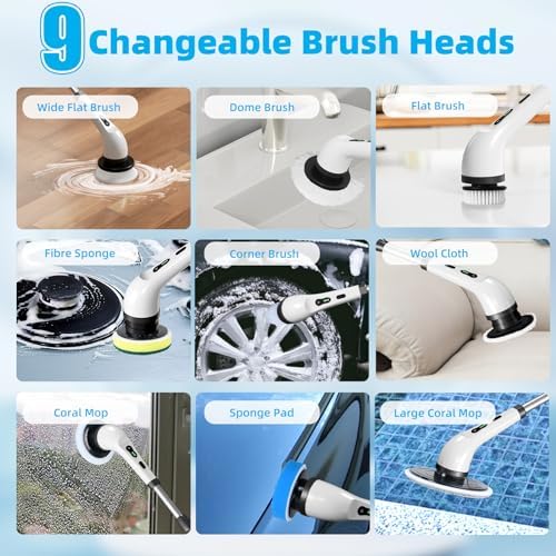 【Durable 9 Replaceable Brush Heads】The electric spin scrubber cordless tub and tile scrubber is equipped with 8 replaceable brush heads, which can meet your use in almost all scenarios: large flat brush, flat brush, dome brush and corner brush are made of PP bristles, which are very durable and can withstand vigorous pressing for removing stubborn stains. Coral mop, chenille mop, scouring pad and sponge pad are made of different high-quality soft materials to ensure gentle and safe cleaning and waxing on delicate surfaces without leaving any marks.
