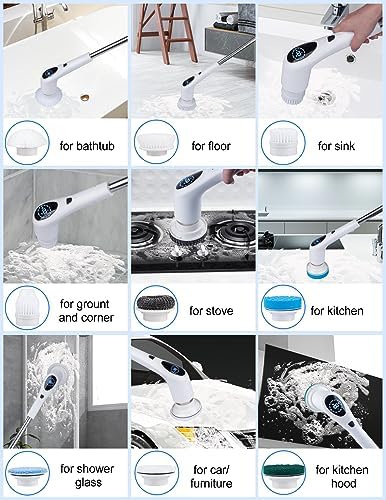 【9 REPLACEABLE BRUSHES – VERSATILITY MEAT ALL CLEANING NEEDS】This electric scrubber for cleaning comes with 9 replaceable brushes for various scenarios: ①Large flat brush is suitable for large flat surfaces, floors;②Dome brush for bathtub, toilet;③Small flat brush for small flat surface;④Corner brush for corners, wheel hubs;⑤Sponge brush for glass, car;⑥Cloth brush for glass tile;⑦Fiber brush for oven stove, sink;⑧Anti wool plate for car; ⑨ Stainless steel scrubber for pots, grills, and more.