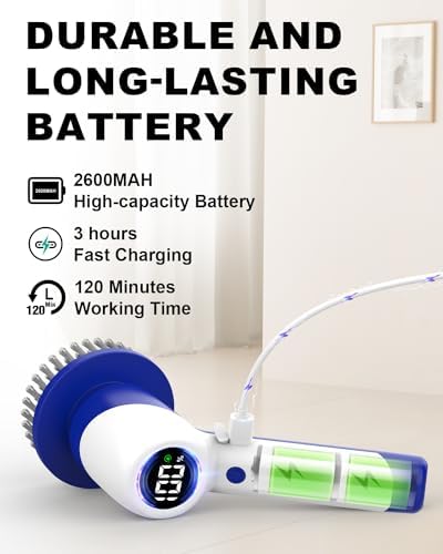 【Rechargeable & Large Capacity & Cordless】Our cordless shower scrubber adopts a TYPE-C charging interface and has 2600mAh large capacity battery. It only requires 3 hours of fast charging and can work for two hours. You can use this power scrubber very conveniently to clean any corner of the room.