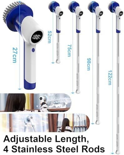 【4-section Adjustable Long Rod】The bathroom scrubber has 4 adjustable long rods that can be adjusted from 10.63 inches to 48 inches. You can connect the stainless steel rod to the electric spin scrubber by rotating it, increasing the length of the cleaning brush and easily cleaning the bathtub and ceiling without bending down, suitable for the elderly and patients with back pain.