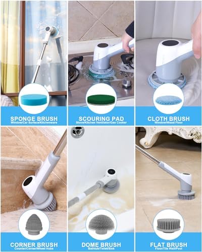 【6 Multi-functional Brush Heads】The cordless cleaning brush includes 6 replaceable brush heads, suitable for different scenarios. For example, round brush can clean concave areas such as bathtubs and sinks, corner brush can clean narrow and difficult to reach areas such as corners and gaps, flat brush can clean surfaces such as ceramic tiles and floors, sponge brush can clean glass. Different scenarios use corresponding brush heads, which can be referred to in the manual and image introduction.