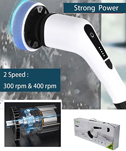 It has 7 kinds of brush heads, can be used for most cleaning job, even for dishes, polishing and waxing.It has more and longer extensions (up to 40 in), can cover more areas .It is very light, only 0.8lb.Its remaining power can be displayed .The scrubber can switch speeds between 300-400rpm.Waterproof performance is also very good.USB charging takes only 5 hours.