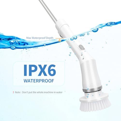 ⭐[Cordless Design & IPX6 Waterproof] Cordless bathroom scrubber design enables use anywhere, anytime in the home. IPX6 waterproof level can resists splashes, while please don’t completely submerged the whole spin scrubber in water. Recommended to removing the brush head separately for cleaning.