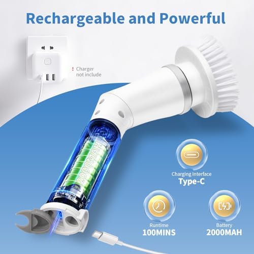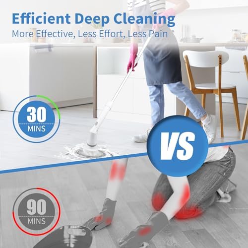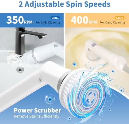 ⭐[2 Speeds Control & Excellent Battery Life] Electric spin scrubber has 2 adjustable spin speeds. Low speed of 350RPM mode for the daily clean. High speed of 400RPM mode for deep cleaning. Power scrubber used 2000 mAh high-quality lithium battery, can last continuously up to 100mins after full charging.