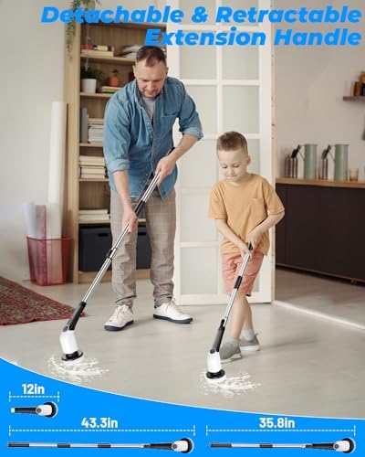 💦【Shower Scrubber with Long Handle &Adjustable Length】scrubber brush with long handle and short handle, the handle extends from 12 in to 43.3 in without bending and kneeling.The electric scrubber for cleaning allows you not to bend down and kneel to clean, avoiding arm pain, knee pain, back pain, and all kinds of discomfort. The power scrubbers for cleaning the bathroom is especially helpful for housewives, the elderly, and those who are responsible for housework.