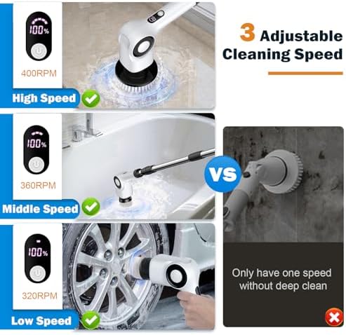 4 Adjustable Handle Lengths: The rotating cleaning brush with extendable handle features a four-section design, allowing adjustment from 10.4 inches to 50 inches. Whether it’s floors, walls, bathrooms, or ceilings, you can clean with ease, without bending over.