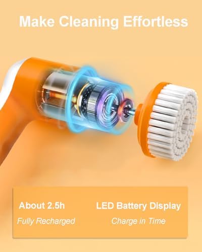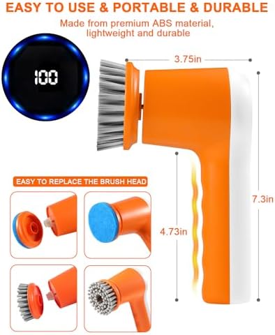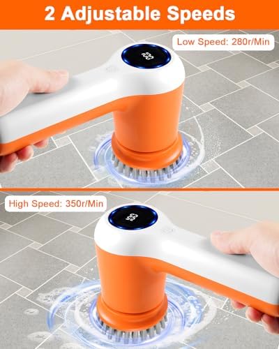 【With 5 Cleaning Brush Head】Our electric cleaning brush kit comes with four different brush heads that have various shapes and sizes for cleaning on all types of surfaces. The flat brush head is perfect for cleaning larger surfaces such as floors, showers, and bathtubs.The corner brush head is designed for cleaning grout, edges, corners, and car wheels. The scouring pad is especially useful for grime in the kitchen, while the sponge is ideal for cleaning glass surfaces and desks.