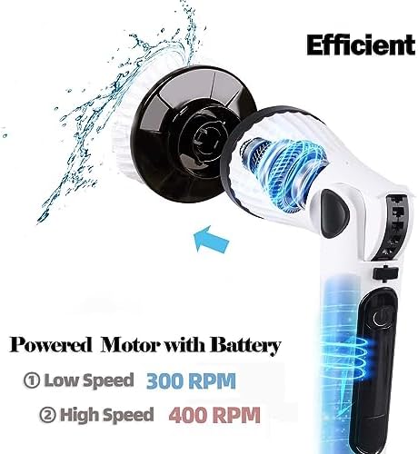 【Powerful motors】The electric floor scrubber has 2 adjustable rotary speeds, low speed mode: 300 revolutions/minute,suitable for daily cleaning, high speed mode 400 revolutions/minute, can be deep cleaning soap scum, cement slurry or stubborn stains.USB charging, 2500 mAh large battery capacity, charging 3-4 hours, can be continuous cordless work for more than 1.5 hours, to meet the demand of the whole bathroom deep cleaning 2-3 times.