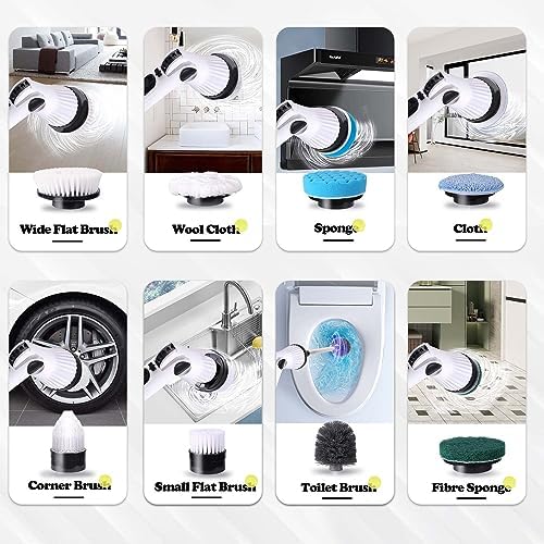 【Save time】With retractable lengths, adjustable brush head angles, and 8 interchangeable brush heads, you actually have a multi-functional electric power scrubber that can meet any of your household cleaning requirements, freeing you from tedious housework. It will easily clean every corner of the room: e.g. bathroom bathtubs, kitchens, grills, toilets, sinks, floors, cement grouts, toilets, cars, glass, tiled walls, furniture, windows, plates and nooks,crannies etc. hard-to-reach areas.