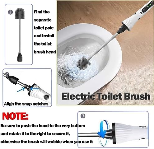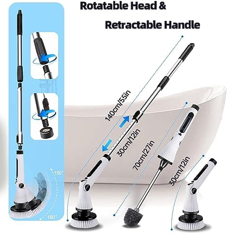 【Multifunction】There are three main types of electric brush for cleaning:① Electric bathroom scrubber with long handle:No need to bend down to clean. You can choose the desired length, up to 12 inches, the overall handle is adjustable from 30-55 inches. ② Electric toilet brush:Install toilet brush head and pole, efficient toilet cleaning.③ Electric spin scrubber cordless: Remove all the poles, a single 16-inch electric cleaning brushes for handhold use,0-90°adjustable brush head angle.
